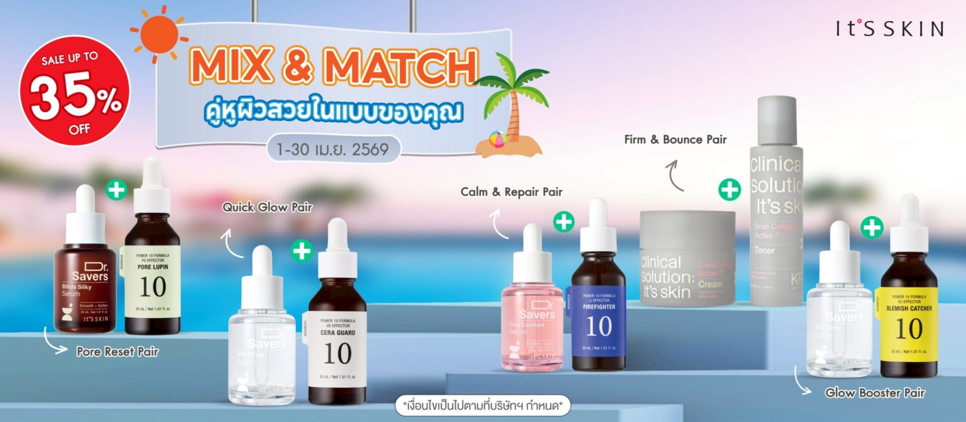 It’S SKIN “Exclusive Trip at Huahin with MEEN-PING” 2 วัน 1 คืน วันที่ 6-7 พฤษภาคม 2566 . อิทส์สกิน ไทยแลนด์ ชวนชาวแอเรีย 86 ร่วมเป็น 1 ใน 20 ท่าน ได้เข้าร่วมกิจกรรมสุดพิเศษ It’S SKIN “Exclusive Trip at Huahin with MEEN-PING” 2 วัน 1 คืน วันที่ 6-7 พฤษภาคม 2566 จัดเต็มความสนุก กับกิจกรรมที่มีให้ตลอดทริปอย่างแน่นอน ดินเนอร์ริมทะเลหัวหิน พร้อมชมพระอาทิตย์ตกสุดฟิน กับ มีน-ปิง พรีเซ็นเตอร์สุดหล่อ ที่จะมาทำให้ทริปนี้หวานขนาดไหน ห้ามพลาดกันนะ!! . กติกาการร่วมกิจกรรมดังนี้ Top Spenders 20 ท่าน (Exclusive Trip at Huahin with MEEN-PING) Lucky Fans 10 ท่าน (Exclusive Video Call with MEEN-PING) . TOP SPENDERS จำนวน 20 ท่าน (Exclusive Trip at Huahin with MEEN-PING) กดติดตาม FB และ IG It’S SKIN Thailand เป็นสมาชิก It’S SKIN Thailand (เพื่อทำการสะสมยอดเข้าระบบสมาชิกได้) มียอดซื้อสูงสุด 20 อันดับ ระหว่างวันที่ 4 เม.ย.-3 พ.ค.66 (ในรายการซื้อสะสมจะต้องมี Power 10 Formula Effector Advanced YE และ VC อย่างละ 1 ชิ้น) สมาชิกทุกท่านสามารถเช็คยอดสะสมได้ที่ It’S SKIN Thailand Shop ทุกสาขา และทาง Line Official : @itsskinthailand ประกาศผล Top Spender จำนวน 20 ท่าน ในวันที่ 4 พ.ค.66 เวลา 18.00 น. เป็นต้นไป ผ่านทาง fb : It’S SKIN Thailand BENEFIT ที่จะได้รับ Top Spender 1-20 ได้เข้าร่วมทริป It’S SKIN “Exclusive Trip at Huahin with MEEN-PING” Top Spender 1-20 ได้รับของที่ระลึกและรูปโพราลอยด์พร้อมลายเซ็น (กิจกรรม FANSIGN) Top Spender 1-20 ได้ถ่ายรูปคู่กับ MEEN-PING Top Spender 1-10 ได้ถ่ายรูปเซลฟี่คู่ MEEN-PING Top Spender 1-10 Exclusive Talk with MEEN-PING (Top 1-2 : 5 นาที, Top 3-5 : 3 นาที, 6-10 : 2 นาที) Top Spender 1-10 ได้รับของขวัญพิเศษ จาก MEEN-PING (ช่วง Exclusive Talk) Top Spender 1-2 ได้เล่นเกมส์กับ MEEN-PING . LUCKY FANS จำนวน 10 ท่าน (Exclusive Video Call with MEEN-PING 2 นาที) กดติดตาม FB และ IG It’S SKIN Thailand ซื้อสินค้า It’S SKIN ครบ 500 บาท ร่วมลุ้นได้ 1 สิทธิ์ ซื้อสินค้าระหว่างวันที่ 4 เม.ย.-3 พ.ค.66 (30 วัน) ส่งใบเสร็จร่วมลุ้นได้ที่ลิงค์ ประกาศผล Lucky fans จำนวน 10 ท่าน ในวันที่ 4 พฤษภาคม 2566 เวลา 18.00 น. เป็นต้นไป ผ่านทาง fb : It’S SKIN Thailand . โปรโมชั่น สินค้าทุกรายการลด 20% ซื้อสินค้าครบ 2,500 รับฟรี mini Standee 1 ชิ้น + Shopping Bag 1 ใบ + member Card 1 ใบ ซื้อสินค้าครบ 5,000 บาท รับเพิ่ม รูปโพราลอยด์เซลฟี่ 1 ใบ (random รูป)